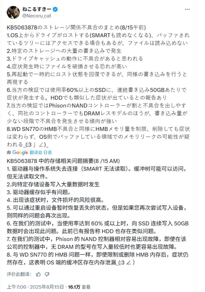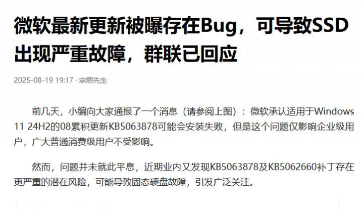 前几天,小编向大家分享了一个消息(请参阅上图):有多个主要来自日本用户吐槽,表示他们在安装了微软不久前所发布的KB5063878更新之后,固态硬盘出现故障,引发广泛关注,本文的主题是分享最新的发展动态。